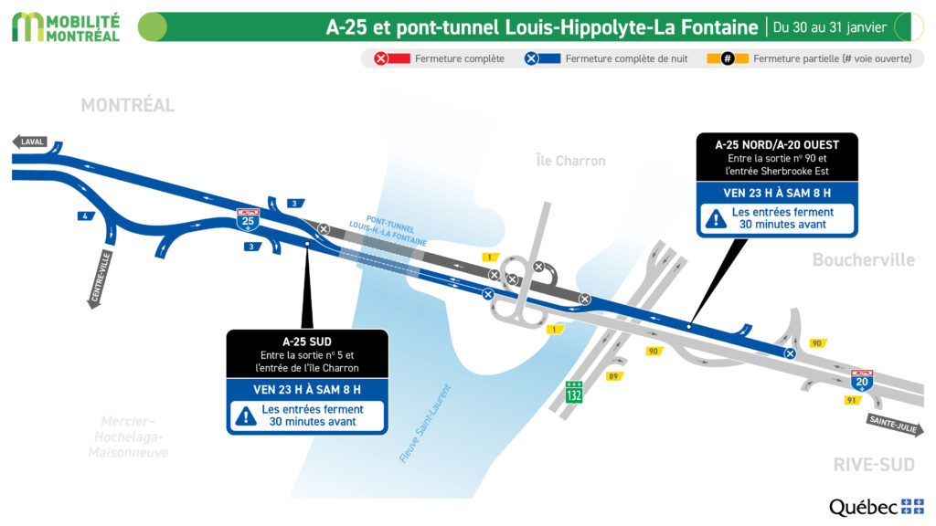 - Fermeture complète de l’autoroute 25 en direction de Montréal (incluant le tunnel Louis-Hippolyte-La Fontaine) entre la sortie n° 90 (autoroute 20 ouest, route 132, La Prairie, USA, Varennes, aéroport P.‑E.‑Trudeau) et l’entrée en provenance de la rue Sherbrooke Est.