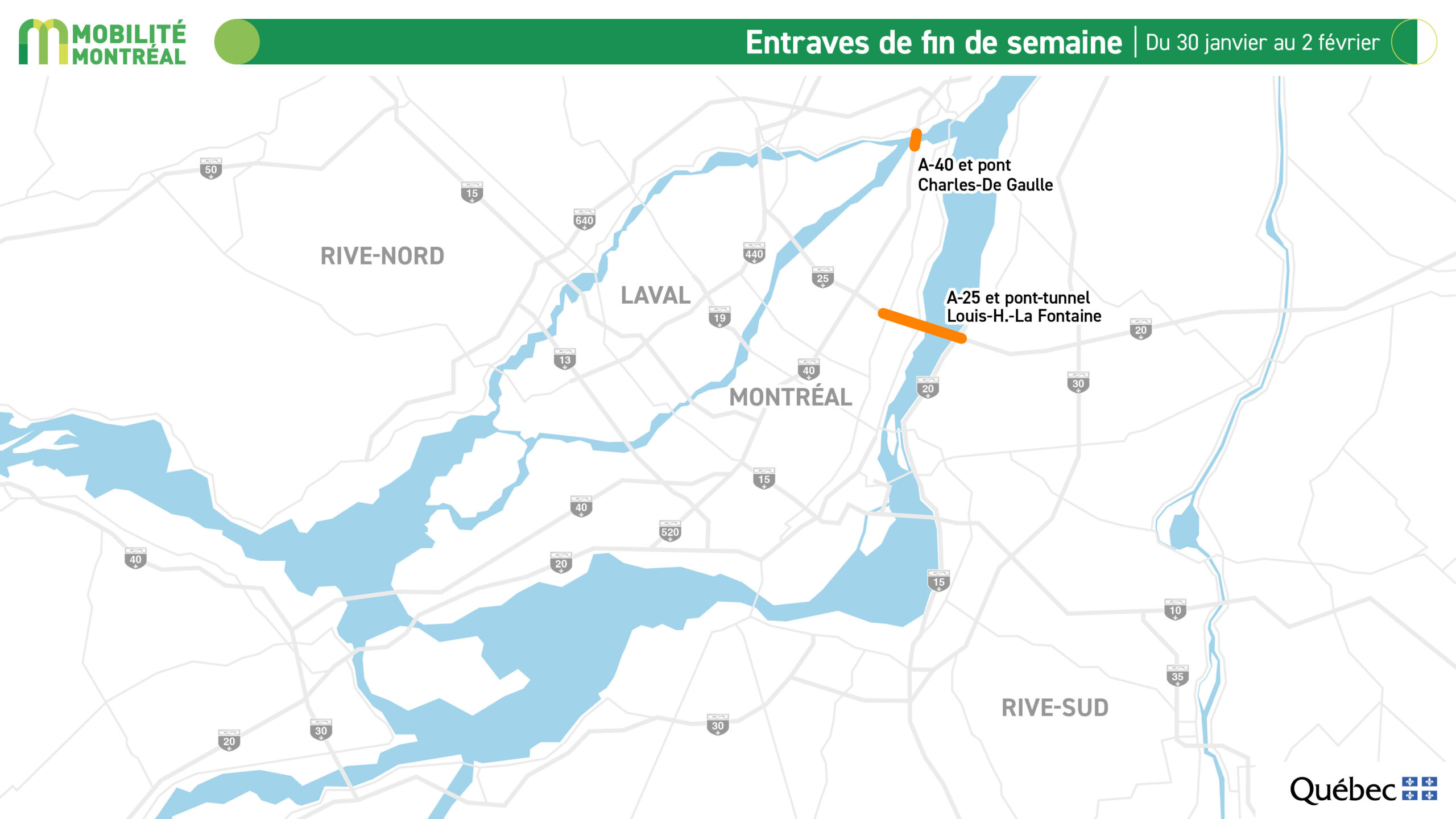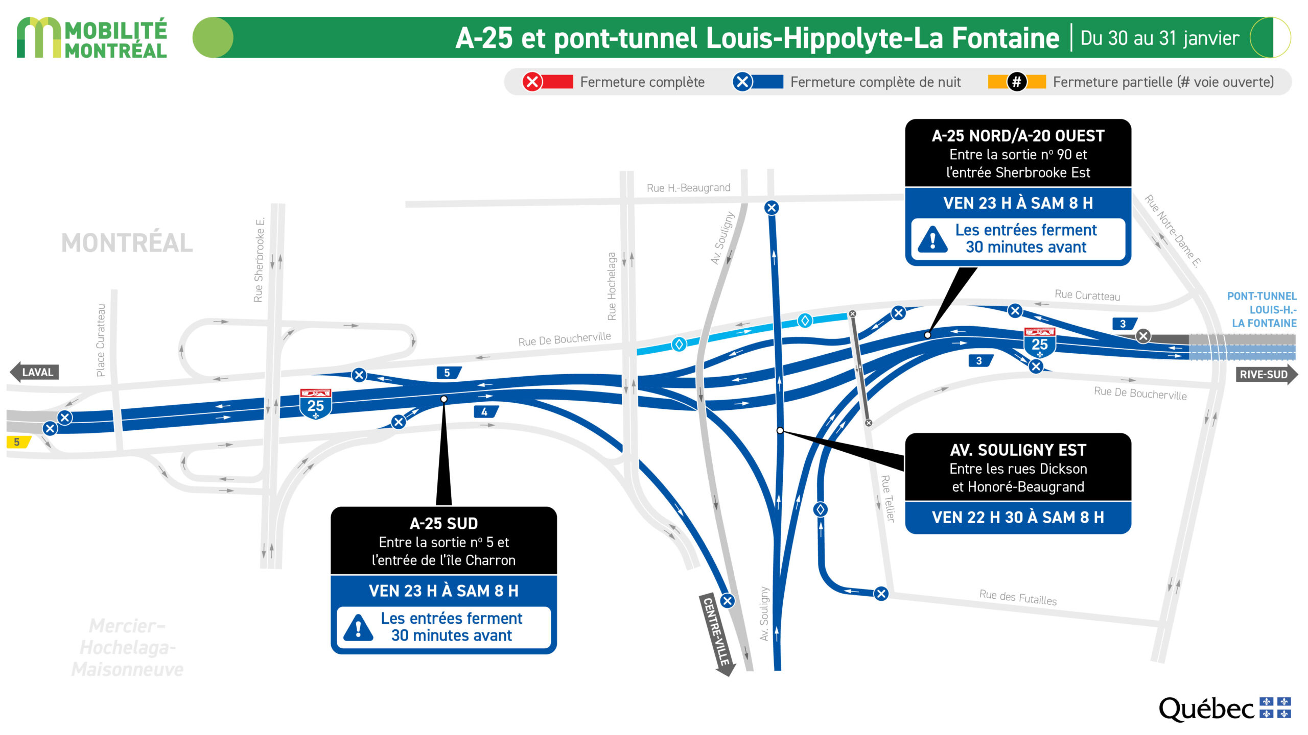 - Fermeture complète de l’autoroute 25 en direction de Montréal (incluant le tunnel Louis-Hippolyte-La Fontaine) entre la sortie n° 90 (autoroute 20 ouest, route 132, La Prairie, USA, Varennes, aéroport P.‑E.‑Trudeau) et l’entrée en provenance de la rue Sherbrooke Est.